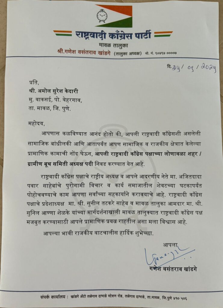लोणावळा: राष्ट्रवादी काँग्रेस पक्षाने आगामी निवडणुका लक्षात घेता संघटनात्मक बांधणीला सुरुवात केली आहे. याच अंतर्गत, लोणावळा शहर आणि ग्रामीण भागासाठी राष्ट्रवादी विद्यार्थी काँग्रेसचे माजी अध्यक्ष अमोल केदारी यांची बुथ अध्यक्षपदी निवड करण्यात आली आहे.