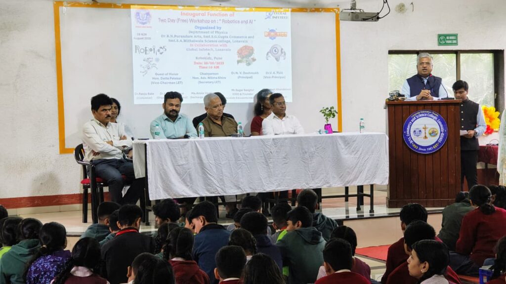 लोणावळा : येथील डॉ. बी. एन. पुरंदरे कला, वाणिज्य आणि विज्ञान महाविद्यालयाच्या भौतिकशास्त्र विभागाने ग्लोबल इन्फोटेक लोणावळा आणि रोबोकीड्झ पुणे यांच्या सहकार्याने ‘रोबोटिक्स आणि ए.आय.’ या विषयावर दोन दिवसीय आंतरशालेय कार्यशाळेचे आयोजन केले होते. या कार्यशाळेत लोणावळ्यातील विविध शाळा व महाविद्यालयांमधील २५० विद्यार्थ्यांनी सहभाग घेतला.