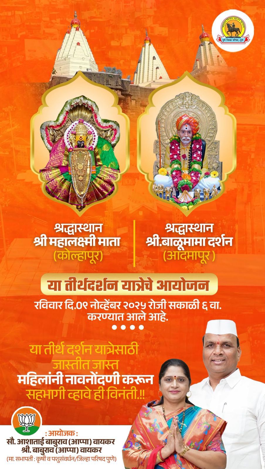 लोणावळा : कार्ला खटकाळे जिल्हा परिषद गटातील भाविकांसाठी एक विशेष धार्मिक तीर्थयात्रा आयोजित करण्यात आली आहे. रविवार, दि. ९ नोव्हेंबर २०२५ रोजी पहाटे ६ वाजता ही यात्रा श्री महालक्ष्मी माता (कोल्हापूर) आणि श्री बाळूमामा दर्शन (आदमापूर) या दोन महत्त्वाच्या पवित्र स्थळांसाठी प्रस्थान करणार आहे.